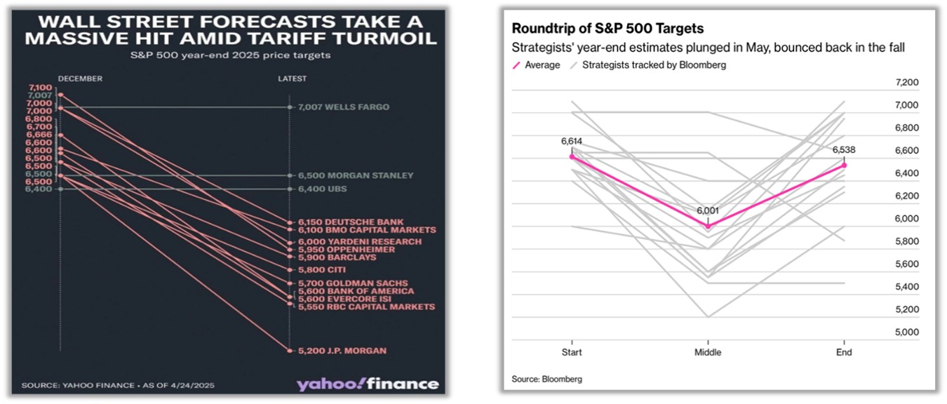 That moment turned out to be the market bottom. From the April 8 lows, the S&P 500 went on to gain nearly 40% through year-end. As prices recovered, forecasts were revised upward again – just in time to explain what had already happened.